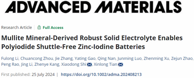 近日,bevictor1946韦德官网史晓东副教授所在团队在能源化学领域顶级期刊Advanced Materials (IF=27.3)发表题为“Mullite mineral-derived robust solid electrolyte enables polyiodide shuttle-free zinc-iodine batteries”的研究论文。bevictor1946韦德官网李富龙硕士(研一)、周传聪博士(博三)和张杰硕士(研二)为论文共同第一作者,bevictor1946韦德官网史晓东副教授和田新龙教授为论文共同通讯作者,bevictor1946韦德官网为论文唯一通讯单位。
