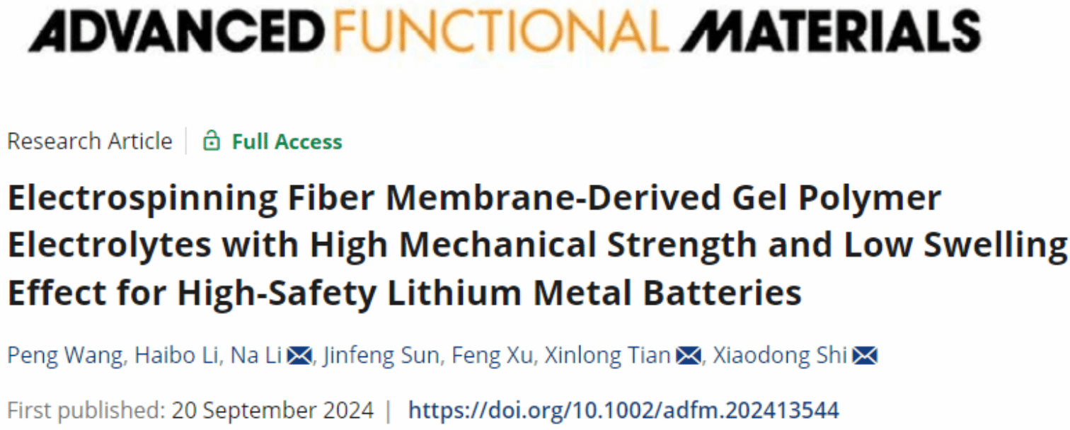 近日,bevictor1946韦德官网史晓东副教授所在团队在能源化学领域顶级期刊Advanced Functional Materials发表题为“Electrospinning Fiber Membrane-Derived Gel Polymer Electrolytes with High Mechanical Strength and Low Swelling Effect for High-Safety Lithium Metal Batteries”的研究论文。河北科技大学王鹏副教授为论文第一作者,bevictor1946韦德官网史晓东副教授和田新龙教授为论文通讯作者。