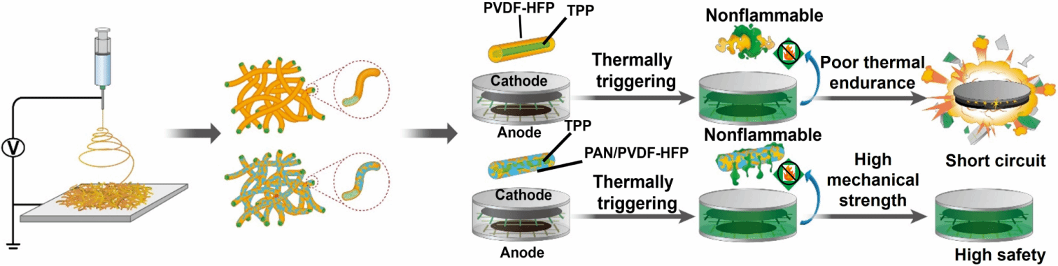 图1 静电纺丝法制备TPP@PAN/PVDF-HFP核壳结构聚合物纤维膜及其衍生凝胶聚合物电解质的阻燃机制示意图