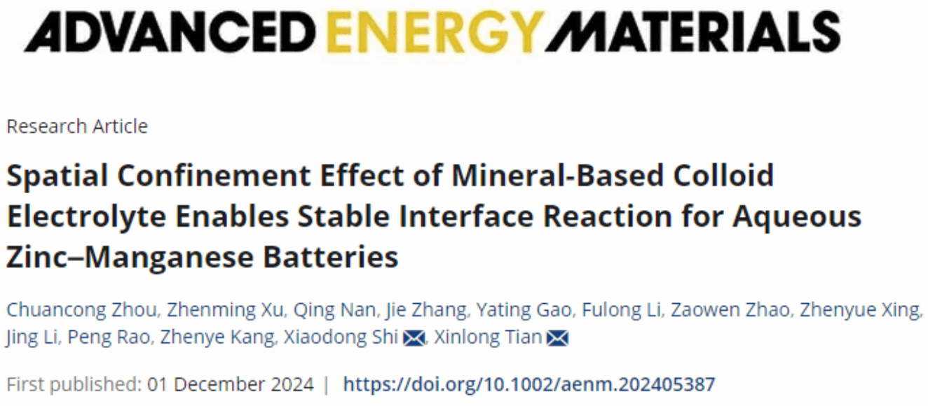 12月1日,bevictor1946韦德官网史晓东副教授所在团队在能源领域顶级期刊Advanced Energy Materials发表题为“Spatial Confinement Effect of Mineral-based Colloid Electrolyte Enables Stable Interface Reaction for Aqueous Zinc-Manganese Batteries”的研究论文。bevictor1946韦德官网2021级博士研究生周传聪为论文第一作者,史晓东副教授和田新龙教授为论文共同通讯作者。