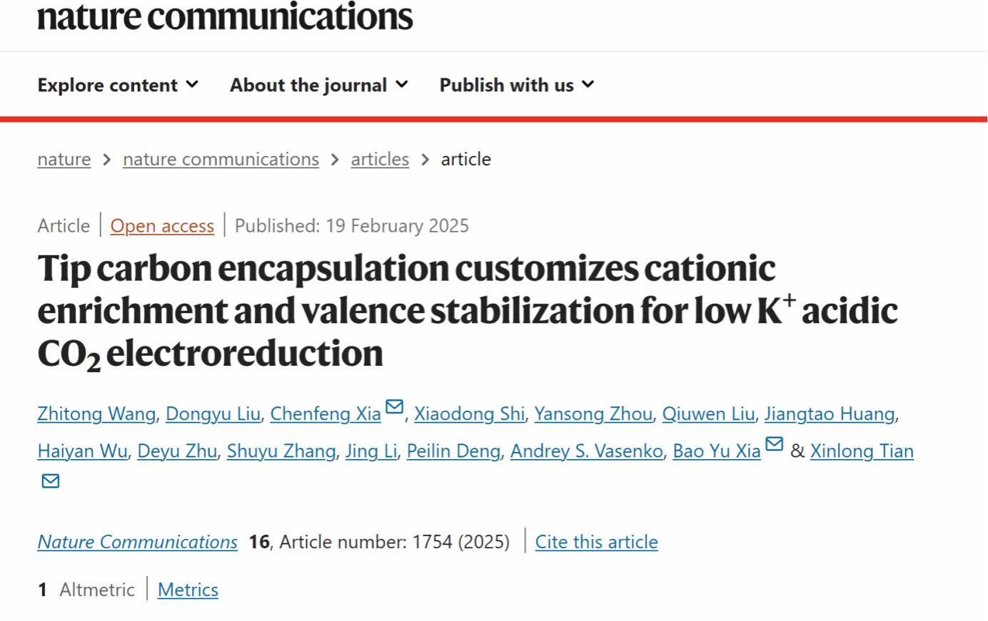近日,bevictor1946韦德官网海洋清洁能源创新团队王志同副教授在能源化学领域Top期刊Nature Communication上发表题为“Tip carbon encapsulation customizes cationic enrichment and valence stabilization for low K+ acidic CO2 electroreduction”的研究论文。bevictor1946韦德官网王志同副教授为论文第一作者,田新龙教授为论文共同通讯作者。